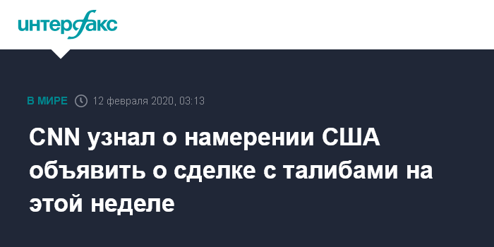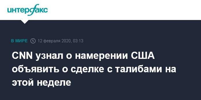 Москва. 12 февраля. INTERFAX.RU - Администрация президента США Дональда Трампа планирует объявить о сделке "по сокращению насилия" с афганским движением "Талибан" (террористическая организация, запрещена в РФ) уже на этой неделе, сообщает CNN со ссылкой на двух американских военных чиновников, знакомых с обсуждениями.