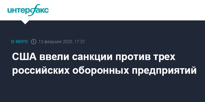 Москва. 13 февраля. INTERFAX.RU - Соединенные Штаты с 3 февраля ввели ограничительные меры против трех российских предприятий в рамках американского закона о нераспространении оружия массового поражения. Об этом говорится в документе, опубликованном в четверг в "Федеральном реестре" США.