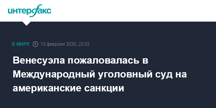 Москва. 13 февраля. INTERFAX.RU - Венесуэла заявила, что обратилась в Международный уголовный суд (МУС) с просьбой расследовать законность американских санкций в отношении страны, сообщает в четверг The Washington Post.