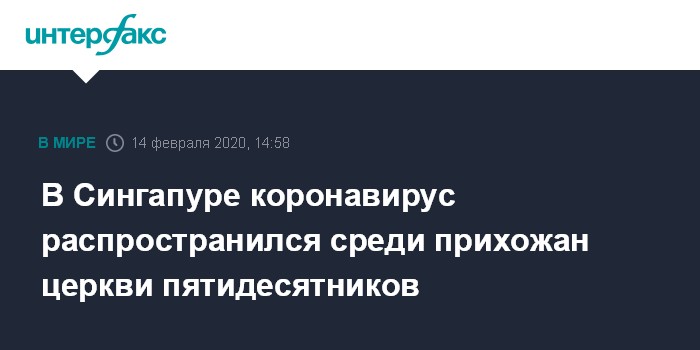 Москва. 14 февраля. INTERFAX.RU - В Сингапуре в пятницу выявлены девять новых случаев заражения коронавирусом нового типа (COVID-19), причем шестеро инфицированных - прихожане церкви пятидесятников Grace Assembly of God Church, сообщила в пятницу сингапурская газета The Straits Times.