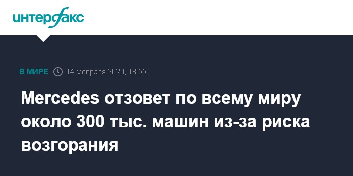 Москва. 14 февраля. INTERFAX.RU - Германский автомобилестроительный концерн Daimler AG отзывает почти 300 тысяч автомобилей Mercedes-Benz из-за опасности возгорания.