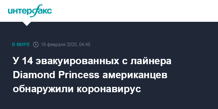 Москва. 18 февраля. INTERFAX.RU - Результат анализа на коронавирус Covid-19 оказался положительным у 14 из 328 американцев, эвакуированных с круизного лайнера Diamond Princess и возвращенных в США, сообщает The Washington Post со ссылкой на высокопоставленного американского чиновника. Позднее эту информацию подтвердили в Госдепартаменте и Министерстве здравоохранения и социальных служб США.