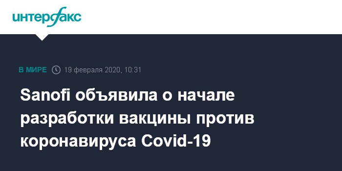 Москва. 19 февраля. INTERFAX.RU - Французская фармацевтическая компания Sanofi объявила, что займется разработкой вакцины против коронавируса Covid-19. При этом она будет использовать собственные наработки по созданию вакцины против атипичной пневмонии SARS, в компании ожидают, что это ускорит и облегчит работу.