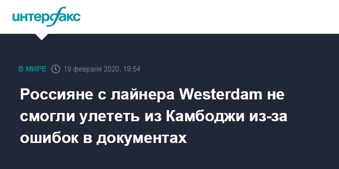 15 февраля трое российских граждан из числа пассажиров круизного лайнера Westerdam прибыли в Петербург из столицы Камбоджи. 19 февраля последние пассажиры Westerdam, находящегося в камбоджийском портовом городе Сиануквиль, покинули судно, сообщили азиатские СМИ. Им разрешили сойти на сушу после того, как все взятые у них пробы на предмет нового типа коронавируса оказались отрицательными.