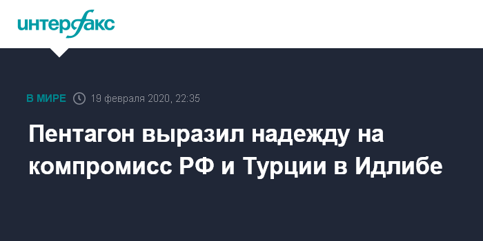 Москва. 19 февраля. INTERFAX.RU - В Пентагоне рассчитывают на то, что России и Турции удастся найти компромисс в сирийской провинции Идлиб.