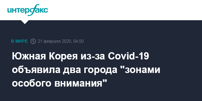Москва. 21 февраля. INTERFAX.RU - Южная Корея объявила в пятницу города Тэгу (2,4 млн жителей) и Чхондо (50 тыс. жителей) "зонами особого внимания" в связи со вспышкой заболевания новым коронавирусом Covid-19.