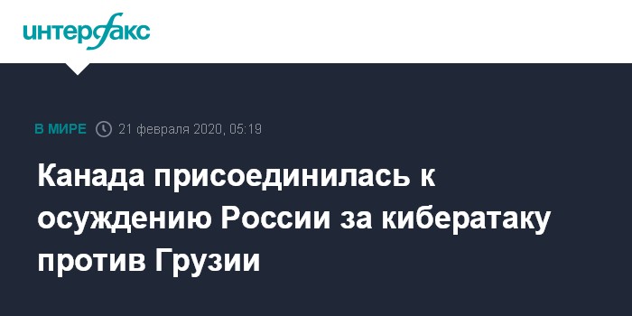 Москва. 21 февраля. INTERFAX.RU - Оттава вслед за США и Великобританией осудила Россию за якобы проведенную кибератаку на грузинские правительственные сайты в октябре 2019 года, сообщается на сайте МИД Канады.