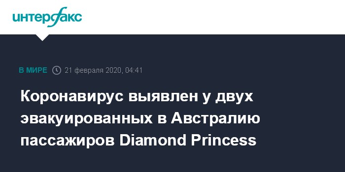 Москва. 21 февраля. INTERFAX.RU - Заражение коронавирусом Covid-19 подтверждено у двух пассажиров, эвакуированных в Австралию с круизного лайнера Diamond Princess, стоящего не карантине в японской Иокогаме, сообщает CNN.