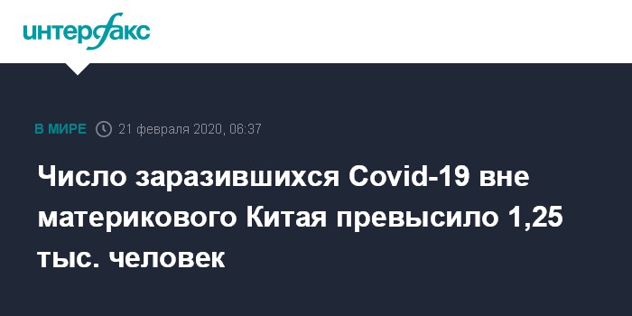 Москва. 21 февраля. INTERFAX.RU - По состоянию на утро четверга, 20 февраля, в мире за пределами материковой части Китая число заразившихся коронавирусом Covid-19 достигло 1251, за сутки выявлено 102 новых случая заболевания, сообщила гонконгская газета South China Morning Post.