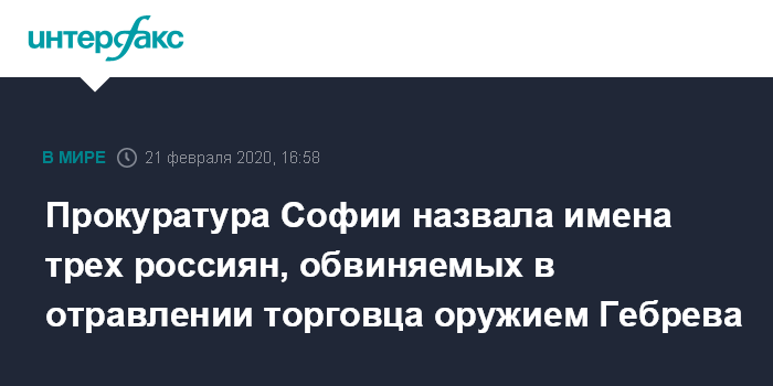 Москва. 21 февраля. INTERFAX.RU - Прокуратура Софии заочно обвинила трех граждан России в покушении на убийство торговца оружием Эмилиана Гебрева, его сына Христо и директора компании "Производственая деятельность" Валентина Тахчиева. Ранее сообщалось, что это покушение проверяют на связь с использованием "Новичка" в Солсбери.