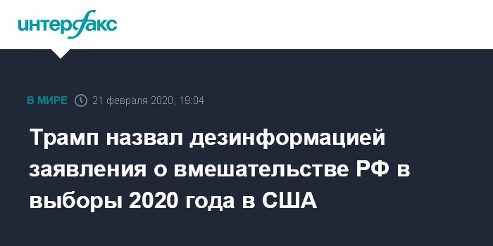 Ранее издание The New York Times со ссылкой на пять осведомленных источников сообщило, что Россия уже начала вмешательство в президентские выборы 2020 года в Штатах, чтобы помочь Трампу переизбраться на второй срок. Об этом официальные представители американской разведки на прошлой неделе предупредили законодателей в Конгрессе США, утверждалось в материале NYT.