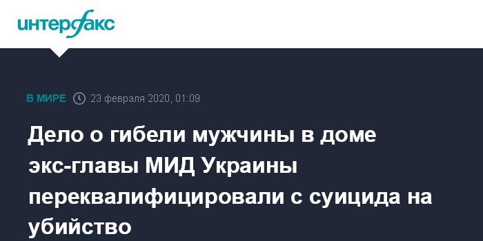 Москва. 23 февраля. INTERFAX.RU - Гибель предпринимателя в доме экс-министра иностранных дел расследуется как умышленное убийство, сообщила пресс-служба Национальной полиции Украины.