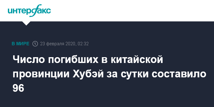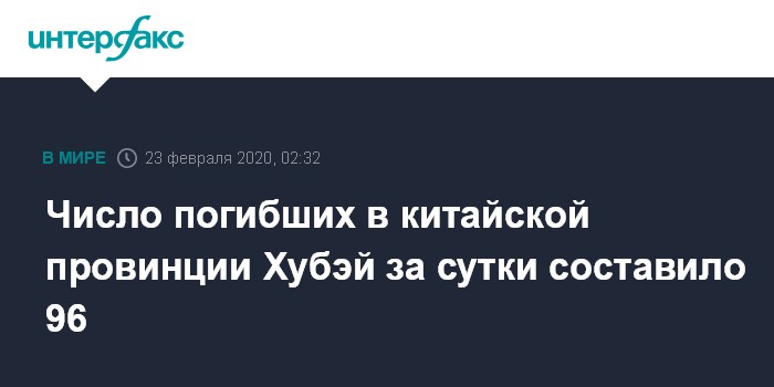 Москва. 23 февраля. INTERFAX.RU - В эпицентре распространения нового типа коронавируса китайской провинции Хубэй за истекшие сутки зарегистрировано 96 случаев летального исхода от пневмонии, вызываемой новым типом коронавируса (COVID-19), и 630 новых заболевших, сообщили местные медицинские власти.