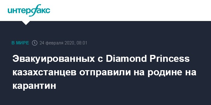 Москва. 24 февраля. INTERFAX.RU - Четверо граждан Казахстана, находившихся на карантинном лайнере Diamond Princess, ранним утром в субботу вернулись на родину и помещены на карантин, сообщил в понедельник агентству "Интерфакс" официальный представитель казахстанского минздрава Диас Ахметшарип.