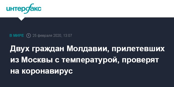 Москва. 25 февраля. INTERFAX.RU - Двух граждан Молдавии, прилетевших в Кишинев минувшей ночью рейсом из Москвы, протестируют на наличие коронавируса, сообщили "Интерфаксу" в пресс-службе министерства здравоохранения, труда и социальной защиты республики.