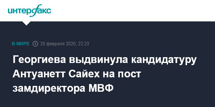 Москва. 25 февраля. INTERFAX.RU - Директор-распорядитель Международного валютного фонда (МВФ) Кристалина Георгиева выдвинула кандидатуру Антуанетт Монсио Сайех на пост заместителя директора.
