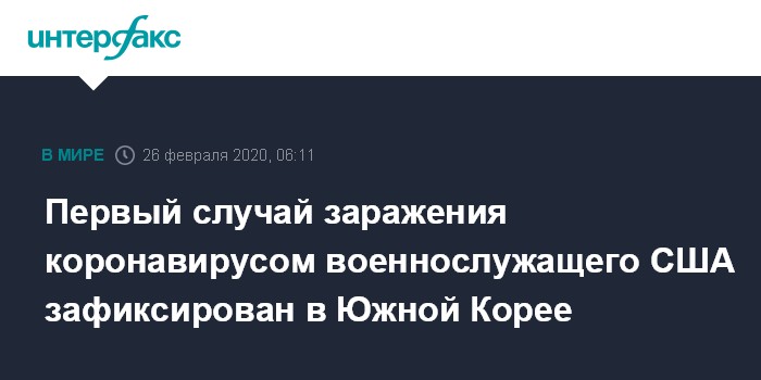 Москва. 26 февраля. INTERFAX.RU - Американский солдат, дислоцированный в южнокорейском городе Чхильгок, показал положительный результат на новый коронавирус, сообщили в среду в Вооруженных Силах США в Южной Корее (USFK).