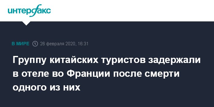 Москва. 26 февраля. INTERFAX.RU - Группу туристов из КНР задержали в отеле во французском городе Бон после того, как от сердечного приступа скончался один из китайских путешественников, сообщает издание Le Journal de Saone-et-Loire в среду.