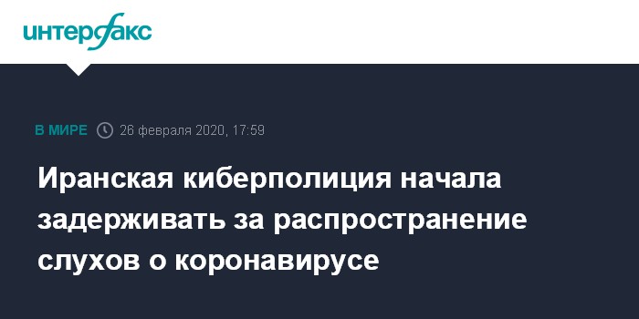 Москва. 26 февраля. INTERFAX.RU - Сотрудники подразделения иранской полиции, специализирующегося на отслеживании нарушений в киберпространстве, задержало 24 человека за распространение в интернете информации о коронавирусе, не соответствующей действительности, сообщает агентство ISNA.