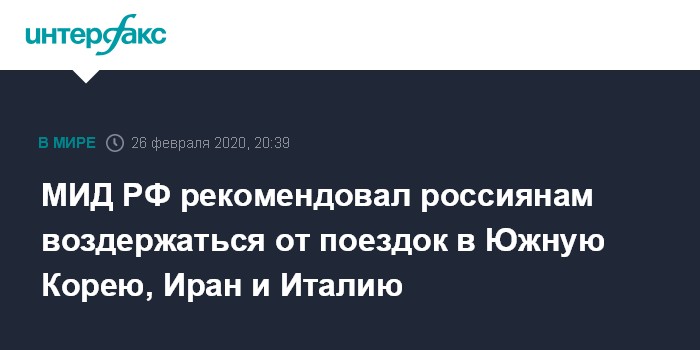 Москва. 26 февраля. INTERFAX.RU - МИД РФ в связи с распространением нового коронавируса в Южной Корее, Иране и Италии рекомендует российским гражданам воздержаться от поездок в эти страны, если только "они не вызваны крайней необходимостью", говорится в сообщении на сайте министерства.