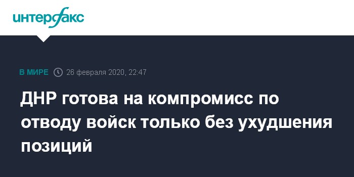 Москва. 26 февраля. INTERFAX.RU - Самопровозглашенная Донецкая народная республика (ДНР) готова идти на компромисс в вопросе отвода войск при условии сохранения контроля над населенными пунктами в зоне разведения, заявил представитель самопровозглашенной Донецкой народной республики в подгруппе по безопасности на переговорах в Минске Алексей Никоноров.