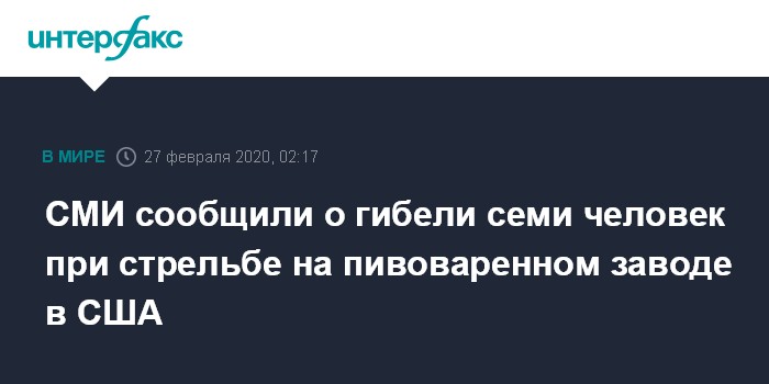 Москва. 27 февраля. INTERFAX.RU - В результате стрельбы на пивоваренном заводе Molson Coors в городе Милуоки одноименного американского штата погибли семь человек, включая мужчину, открывшего огонь, сообщают местные СМИ.