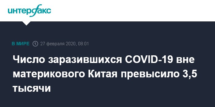 Москва. 27 февраля. INTERFAX.RU - На утро 27 февраля в мире, за исключением материковой части Китая, число заразившихся коронавирусом COVID-19 достигло 3530, увеличившись за сутки на 627 выявленных случаев заболевания, сообщила гонконгская газета South China Morning Post.