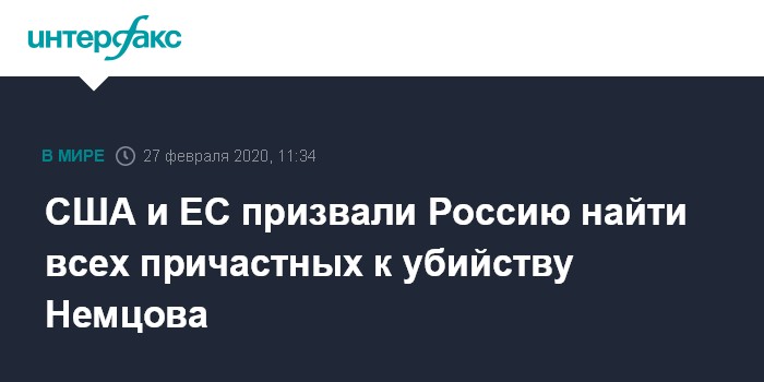 Москва. 27 февраля. INTERFAX.RU - В США и Евросоюзе призвали Россию провести полное расследование убийства оппозиционера Бориса Немцова и найти в том числе заказчиков преступления. Об этом заявили зампосла США в Москве Барт Горман и представитель Внешнеполитической службы ЕС.