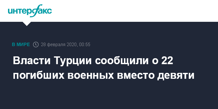 Москва. 28 февраля. INTERFAX.RU - Сирийский авиаудар в Идлибе привёл к гибели 22 турецких военных, заявили власти турецкой приграничной провинции Хатай.