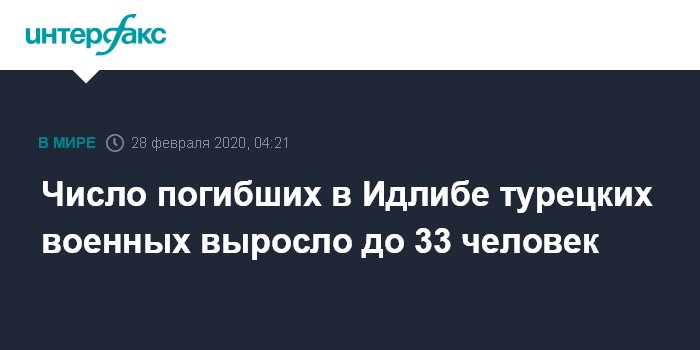 Москва. 28 февраля. INTERFAX.RU - Сирийский авиаудар в Идлибе привёл к гибели 33 турецких военных, заявили журналистам власти турецкой приграничной провинции Хатай.