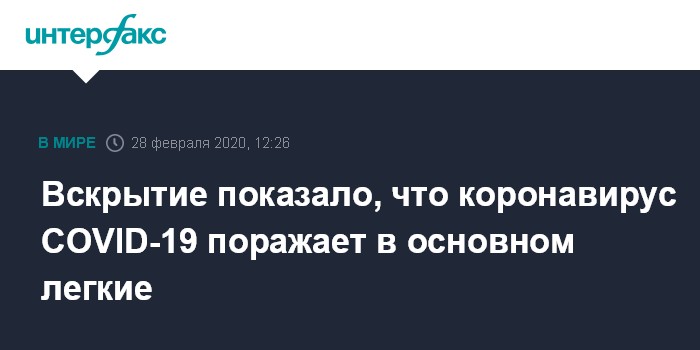 Москва. 28 февраля. INTERFAX.RU - Вскрытие жителя Уханя, умершего от пневмонии, показало, что коронавирус COVID-19 поражает преимущественно легкие. Данных о поражении других органов у экспертов недостаточно, пишет South China Morning Post со ссылкой на публикацию в китайском Journal of Forensic Medicine.