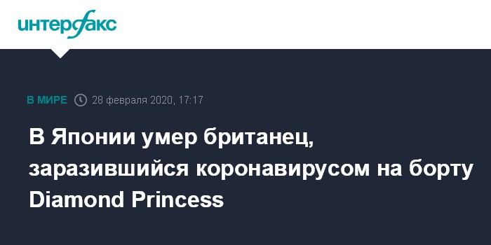 Москва. 28 февраля. INTERFAX.RU - Подданный Великобритании скончался в Японии, заразившись новым типом коронавируса во время пребывания на борту круизного судна Diamond Princess, сообщают японские СМИ.