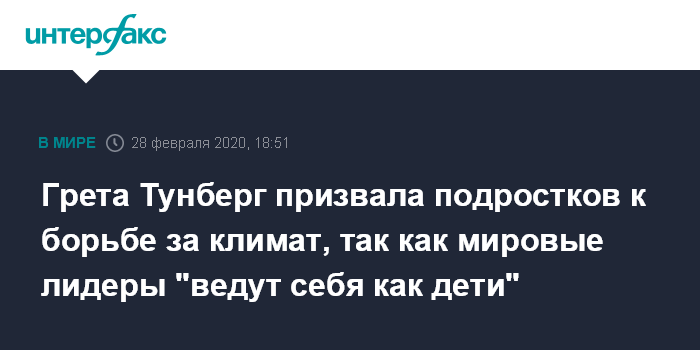 Москва. 28 февраля. INTERFAX.RU - Юная шведская экоактивистка Грета Тунберг на массовой акции протеста в английском городе Бристоль заявила, что мировые лидеры игнорируют проблему изменения климата и "ведут себя как дети".