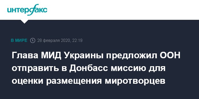 Москва. 28 февраля. INTERFAX.RU - Министр иностранных дел Украины Вадим Пристайко сообщил, что во время визита в США он обратился к руководству ООН с просьбой прислать на Украину миссию, которая оценит возможность размещения на Донбассе миротворческой миссии ООН.