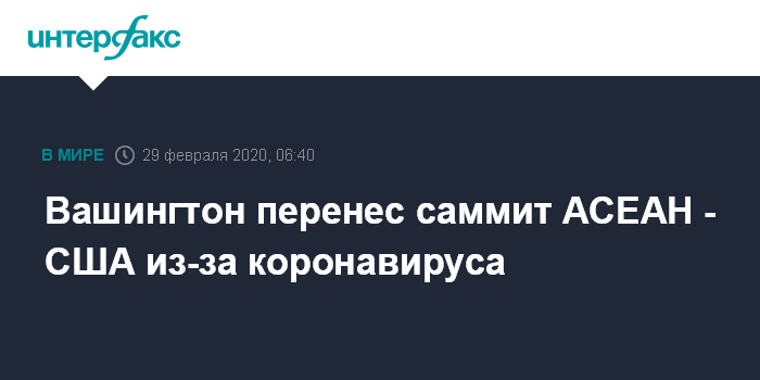 Москва. 29 февраля. INTERFAX.RU - Соединенные Штаты на фоне быстрого распространения коронавируса COVID-19 решили перенести на более поздний срок саммит АСЕАН - США, который должен был пройти в марте в Лас-Вегасе, сообщает Associated Press со ссылкой на высокопоставленного чиновника американской администрации.