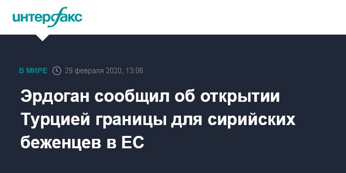 Москва. 29 февраля. INTERFAX.RU - Президент Турции Реджеп Тайип Эрдоган заявил в субботу, что его страна открыла границы с ЕС для сирийских беженцев, сообщает в субботу Anadolu.