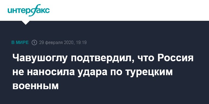 Москва. 29 февраля. INTERFAX.RU - ВКС России по-прежнему оказывают поддержку сирийским правительственным войскам, однако в ударах по турецким военным в Идлибе не участвуют, заявил глава МИД Турции Мевлют Чавушоглу.