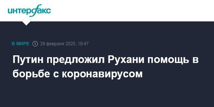 Москва. 29 февраля. INTERFAX.RU - Президент России Владимир Путин выразил соболезнования президент Ирана Хасан Рухани в связи с жертвами в результате вспышки в Иране коронавирусной инфекции и заявил о готовности оказать помощь в противодействии распространению заболевания.