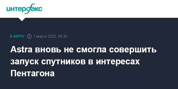 Москва. 1 марта. INTERFAX.RU - Новый частный американский производитель ракет - компания Astra из-за непогоды вновь на сутки перенесла тестовый запуск своего носителя легкого класса Rocket 3.0, который в перспективе по первой заявке должен будет выводить на орбиту военные спутники в интересах министерства обороны США, сообщило Агентство перспективных исследовательских проектов в области обороны (DARPA).
