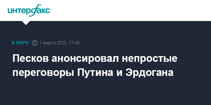 Москва. 1 марта. INTERFAX.RU - Встреча президентов России и Турции Владимира Путина и Реджепа Тайипа Эрдогана будет непростой, заявил в воскресенье пресс-секретарь главы российского государства Дмитрий Песков.
