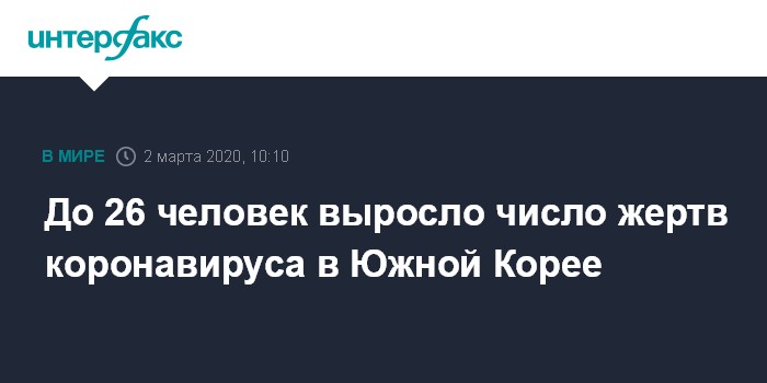 Москва. 2 марта. INTERFAX.RU - Число скончавшихся в результате заражения коронавирусом в Южной Корее увеличилось до 26 человек, сообщают в понедельник южнокорейские СМИ.