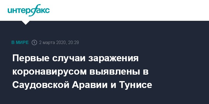 Москва. 2 марта. INTERFAX.RU - Первые случаи заражения коронавирусом зафиксированы в понедельник в Саудовской Аравии и Тунисе, сообщили арабские СМИ со ссылкой на министерства здравоохранения этих стран.