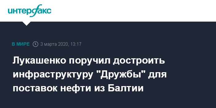 Москва. 3 марта. INTERFAX.RU - Президент Белоруссии Александр Лукашенко поручил правительству страны ускорить строительство инфраструктуры на нефтепроводе "Дружба" для поставок нефти из портов Балтии. Его цитирует "БелТА".