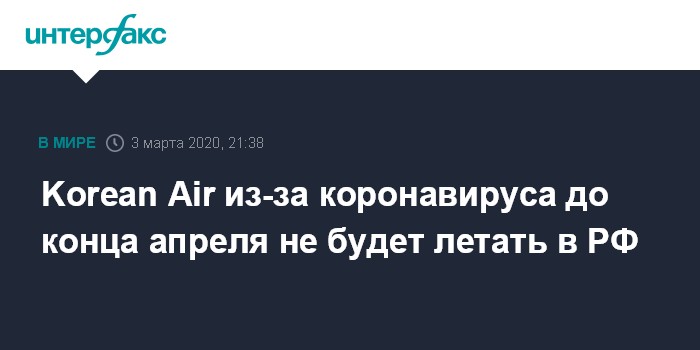 Москва. 3 марта. INTERFAX.RU - Авиакомпания Korean Air приостанавливает до конца апреля рейсы из Сеула в Москву и Владивосток, сообщила во вторник пресс-служба перевозчика.