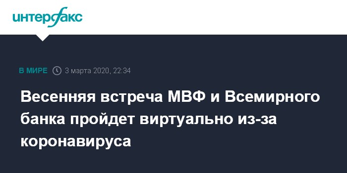 Москва. 3 марта. INTERFAX.RU - Ключевое мероприятие международной финансовой повестки отменено из-за эпидемии коронавируса COVID-19. Международный валютный фонд (МВФ) и Всемирный банк (ВБ) приняли решение провести ежегодную весеннюю встречу в "виртуальном формате", говорится в их совместном заявлении.