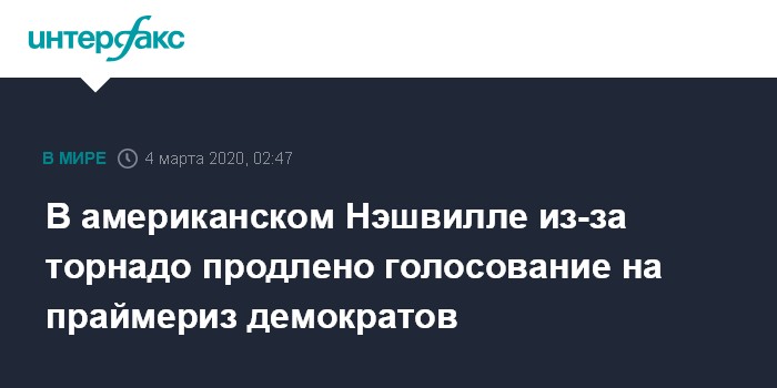 Москва. 4 марта. INTERFAX.RU - Голосование на праймериз демократов в округе Дейвидсон (штат Теннеси), куда входит город Нэшвилл, продлено на три часа решением окружного суда, сообщает CNN.
