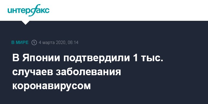 Москва. 4 марта. INTERFAX.RU - Число случаев заболевания коронавирусом COVID-19 в Японии выросло до 1 тыс. по состоянию на утро среды, сообщает NHK со ссылкой на данные японского минздрава.