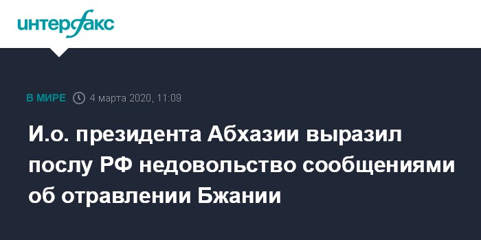 Кроме того, и.о. президента заявил, что руководство республики требует "возбуждения уголовного дела генеральной прокуратурой РФ по факту якобы имевшего место отравления депутата парламента, кандидата в президенты, гражданина Абхазии и Российской Федерации Аслана Бжания на территории Российской Федерации".