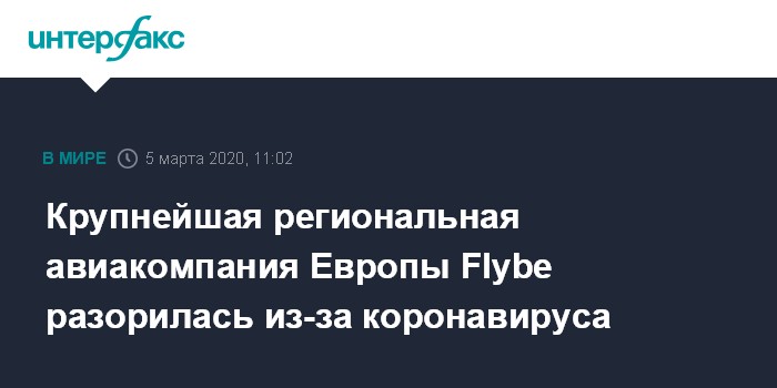 Москва. 5 марта. INTERFAX.RU - Британская авиакомпания Flybe, крупнейший региональный авиаперевозчик Европы, перешла под внешнее управление с 5 марта после отказа правительства выделить ей в кредит 100 млн фунтов. Все рейсы Flybe отменены. Одной из причин компания назвала эпидемию коронавируса, вызвавшую спад спроса, передает BBC News.