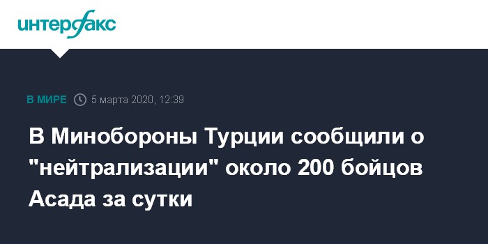 Москва. 5 марта. INTERFAX.RU - Турецкие военные в ходе операции на севере Сирии "нейтрализовали" за последние сутки 184 бойца сирийских правительственных сил и поддерживающих Дамаск ополченцев, сообщили в четверг в Минобороны Турции.